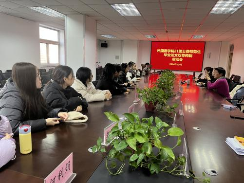 霍翠红书记在总结发言中语重心长地表示,双导师制是学院为学生搭建的优质成长平台,同学们务必珍惜这一难得的机遇。在导师的悉心指导下,一方面要扎实完成高质量的毕业论文,展现外院学子的学术风采;另一方面要积极投入跟岗实践,用心积累教学经验,提升教育教学能力和职业素养,为未来投身教育事业做好充分且完备的准备,在实践中磨砺自我,在学术中追求卓越,向着优秀教育工作者的目标稳步迈进。