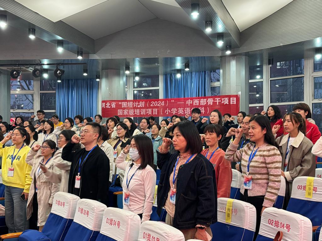 各位学员老师签到后,beat365官网于晚上六点半在南院十阶梯召开开班典礼。典礼以奏唱国歌开场,全体学员肃立,齐唱国歌,现场气氛庄重严肃。典礼上,唐翠云院长指出本次国培项目以新课标背景下小学英语教学实践与创新为主题,体现聚焦师德铸魂,突出智能技术赋能,全面实践创新,注重文化传承四大特色,在人工智能与教育变革的十字路口,用智慧照亮未来,共同探索小学英语教育的无限可能。学员代表老师发言表示要珍惜机会,潜心学习,知行合一,勇于实践,结合教学实际,把培训所得转化为课堂改革的行动,以空杯心态聆听专家讲座。典礼结束后,班主任老师又组织开展了热火朝天的团建活动,现场氛围瞬间沸腾起来。老师们迫不及待地结组,相互热情地介绍着彼此,迅速增进了解。各小组围绕着团队名称、口号及独特pose的设计展开激烈讨论,创意火花四溅。有的小组精心设计准备团结一心拔萝卜的情景剧;有的小组用英语介绍彼此,体现专业特色;有的小组在讨论团队创意口号;还有的小组在排练创意pose。在最终展示环节,各组老师用幽默的语言,有创意的情景剧,激情澎湃的口号获得了阵阵掌声。