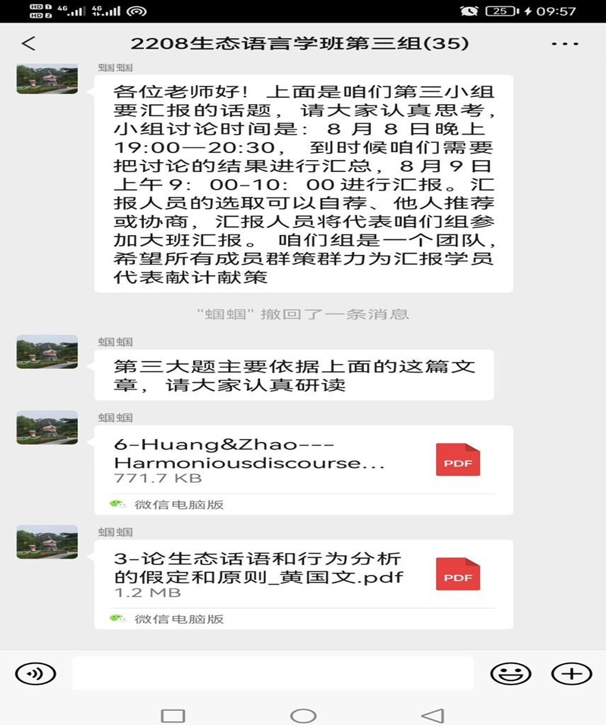 本年度暑期研修班充分发掘线上研修特色,助力教师突破时空隔阂,全国高等院校外语教育专家、学者及一线教师汇聚云端,共探外语教育发展大势,beat365官网共4位教师参与线上研讨并收获了全新研修体验。英语专业方向韦萍老师全程参与了生态语言学研修班,参与小组汇报,就生态语言学发展前沿问题与其他院校教师进行交流。