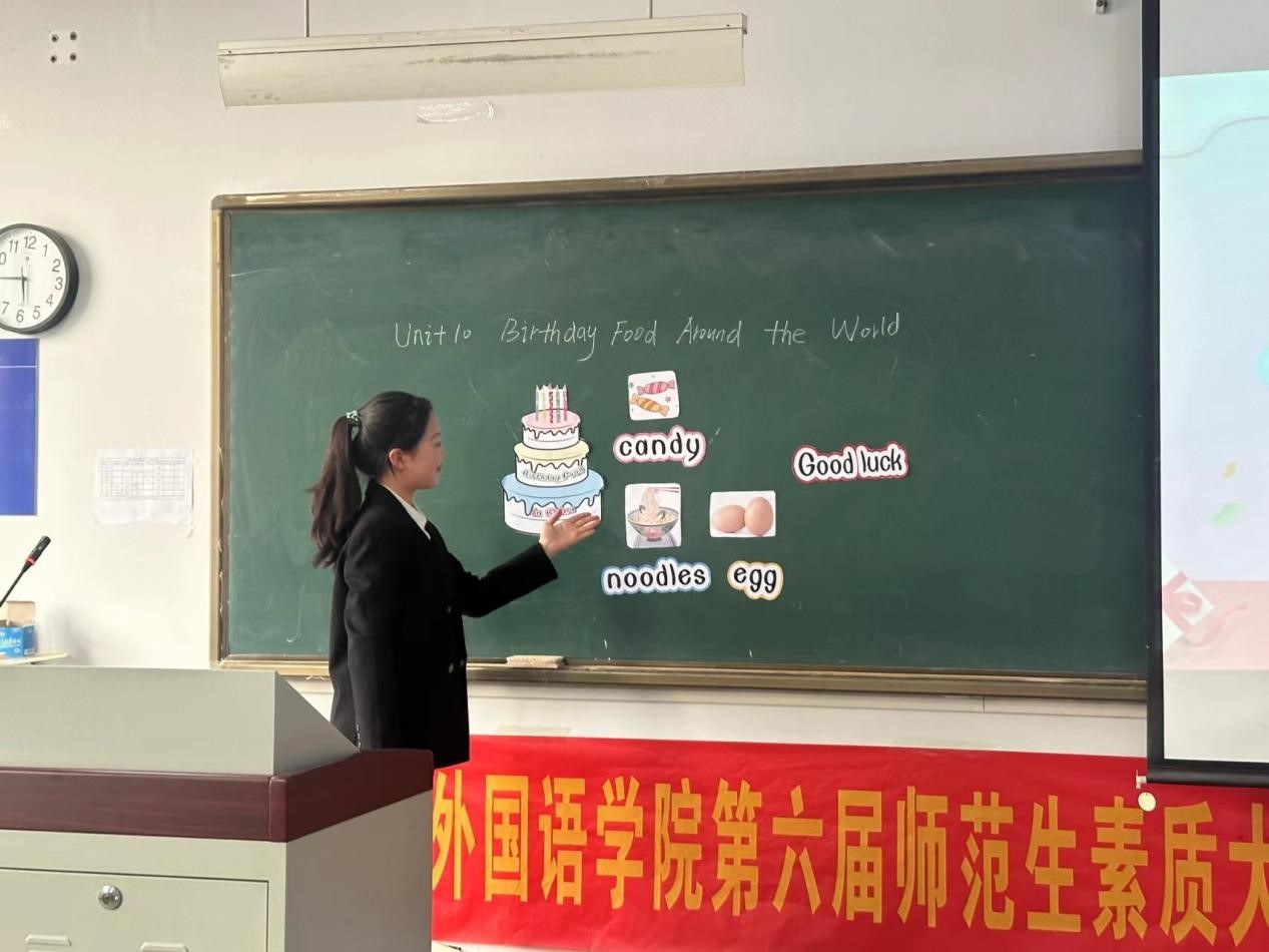 公费师范赛道共有8位选手通过初赛选拔成功晋级复赛。各位选手充分运用多种教学形式和方法,将知识有机融入生动活泼的教学场景中,引导学生积极参与,激发学习的兴趣和动力。其中,徐子茗选手主讲的“Simple Past Tense”主题令人印象深刻,她从定义、时间状语等多个角度切入,深刻地剖析了一般过去时态的用法;高雨彤选手在讲“When is your birthday”时,洪亮的声音、自信的状态使人眼前一亮;邹佳伊冉选手围绕“Birthday”,从生日时吃什么、生日对于人的重要性等方面,使用自制的教具生动地向大家展示了主题内容。