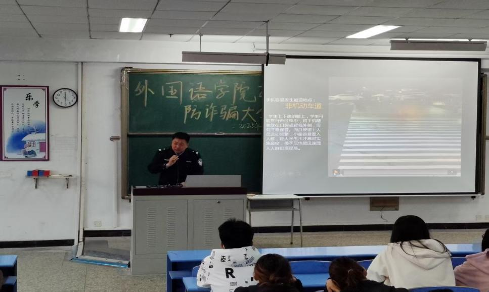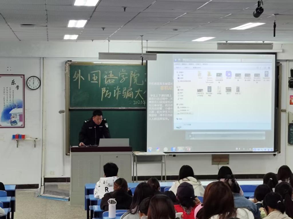 活动伊始,郑老师结合高校诈骗案件高发态势敲响警钟,强调大学生因社会经验不足易成受骗目标,呼吁同学们提高警惕。随后,刘爽警官以丰富案例为切入点,生动讲解各类诈骗手段。在“杀猪盘”案例分析中,他详细拆解诈骗分子通过社交平台伪装身份、建立信任,再诱导转账的全过程;针对网络刷单、虚假中奖、冒充客服等常见骗局,刘爽警官总结出“不轻信、不透露、不转账”的防诈口诀,并传授实用防范技巧。讲解过程中,师生积极互动,同学们围绕“新型诈骗识别”“遭遇诈骗后的止损方法”等问题踊跃提问,现场学习氛围热烈。