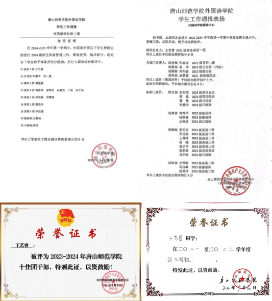 王艺睿始终将“责任”二字镌刻于心。作为班级副班长,她事无巨细,从班级事务管理到活动组织,始终以凝聚集体力量为己任。她的付出赢得了同学们的广泛认可,连续三年荣获“校级三好学生”称号。在学院层面,她从团委干事逐步成长为团委书记兼媒体中心负责人,带领团队策划多项品牌活动,推动学院团学工作迈向高效化与创新化。2024年,她担任新生辅导员助理,从迎新接待到心理访谈,始终以“服务到人、关怀入微”为准则,展现出卓越的组织能力与亲和力、出色的责任感与行动力。这份对学生工作的热爱与坚持,让她荣获“唐山师范学院十佳团干部”“校级优秀团干部”等称号,成为校园中闪耀的服务之星。