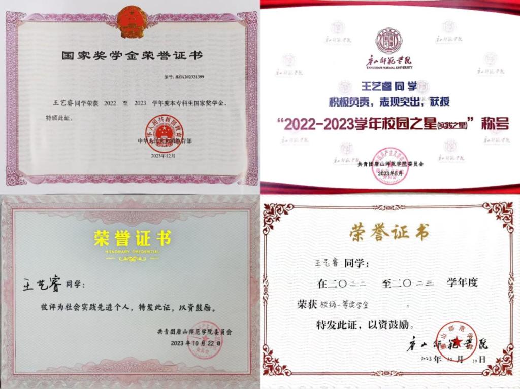 王艺睿的奋斗足迹遍布学业、实践与创新领域。她连续两年获得“校级一等奖学金”,2022-2023学年更以优异成绩摘得“国家奖学金”。在“挑战杯”竞赛、暑期社会实践等活动中,她屡获国家级、省级荣誉,成为校园“实践之星”。作为“校园之星”和“十佳团干部”,她始终以荣誉为鞭策,将每一次肯定转化为前行的动力。她的优秀事迹被学院誉为“从学校优秀学生到社会有为青年”的典范。被评为社会实践先进个人。