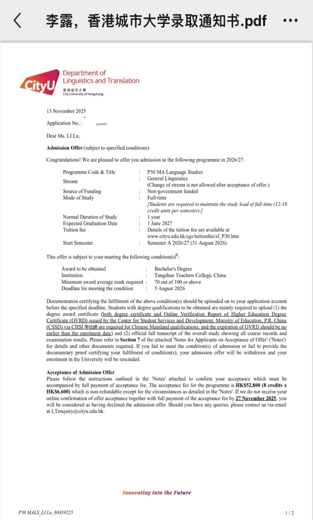近日,beat365官网2022级英语专业学生李露凭借优异表现,成功获得香港城市大学研究生录取通知书,成为beat365官网2026届毕业生中首位获得研究生录取通知书的学生。这一成绩既是她个人勤奋努力的成果,也展现了外国语学院在党建与育人结合方面的持续探索。